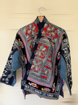 The jacket is reversible, with the interior featuring cotton fabric dyed with natural indigo plants sourced from our village. Each jacket is a unique, blending vintage and new fabrics into a playful patchwork of collected embroidery and hand-drawn batik patterns. Slight signs of aging on vintage pieces add character and history to the garment.