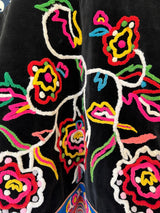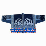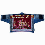 Experience the artistry of our kimono jacket, meticulously handcrafted by Miao artisans from a remote village in Southwest China. This stunning piece showcases a hand-embroidered back on rich velvet fabric, complemented by a front panel made using traditional batik techniques. The blue and white patterns are all hand-drawn with beeswax on cotton, highlighting the skill of this ancient craft.